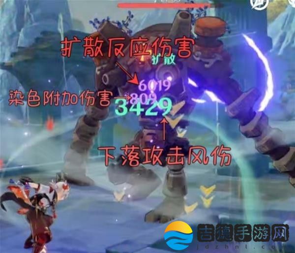 此时下落攻击必定染水,雷水共存时雷元素优先反应,所以需要风先把雷反应完,剩余的风才能与水反应,达成双减抗双增伤。(不过此时触发的其实是双扩散而并非双重扩散)