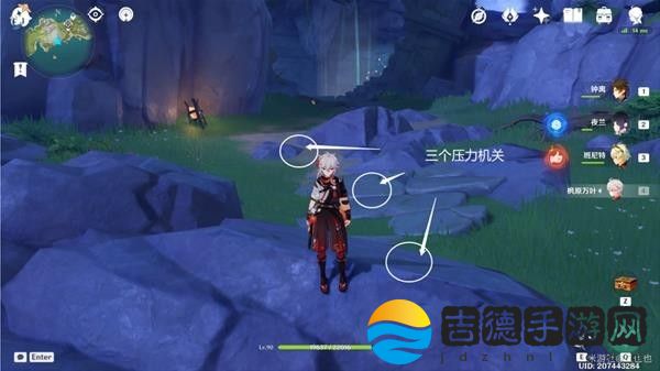 切换岩主+钟离/钟离+安柏/岩主+安柏,激活3个压力机关,取得宝箱一