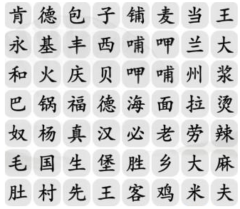 1.汉字找茬王餐饮品牌消除:庆丰包子铺,肯德基,汉堡王呷哺呷哺,德克士,西贝莜面村,必胜客,海底捞,兰州拉面,麦当劳,老乡鸡,大米先生,真功夫,杨国福麻辣烫,巴奴毛肚火锅,永和豆浆大王。