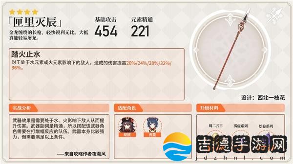 需要水、火影响下,所以基本使用该武器要是水、火属性角色。副词高精通所以需要在增幅反应队伍。匣里灭辰对胡桃而言强度伤害凌驾于其余四星武器和除护摩之杖精一五星武器之上。对香菱而言雷神国家队、万达国际中匣里灭辰也有不错的表现。武器比较适配胡桃、香菱,是比较强力的四星武器。