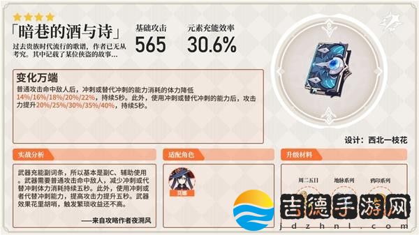 可以这样形容这把武器,主C的武器效果确是辅助、副C的武器面板。四星武器系列辅助和效果强力较多,比如祭礼残章、西风秘典、试做金珀。甚至三星武器讨龙都很多角色使用。没有对比没有伤害,尴尬武器效果目前只推荐莫娜使用,但是同四星系列武器更好选择太多。所以也只适合没有武器萌新过渡使用,不推荐培养。
