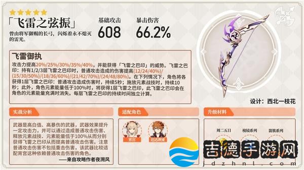 五星武器分析飞雷之弦振宵宫的理想毕业五星武器。宵宫突破加暴击,而该武器副词是高暴伤,所以该武器宵宫圣遗物双暴属性也容易毕业。武器效果攻击力提升属于较通用属性,而武器效果带来普通攻击伤害提升(普通攻击不包括重击),只适合有普通攻击伤害收益角色使用。目前宵宫该武器收益最大。宵宫也可以较为轻松获得三层飞雷之巴印吃满武器特效。达达利亚释放元素战技也可以选择普通攻击为输出方式,同时也能吃满武器特效,所以也可以作为达达利亚毕业五星武器。