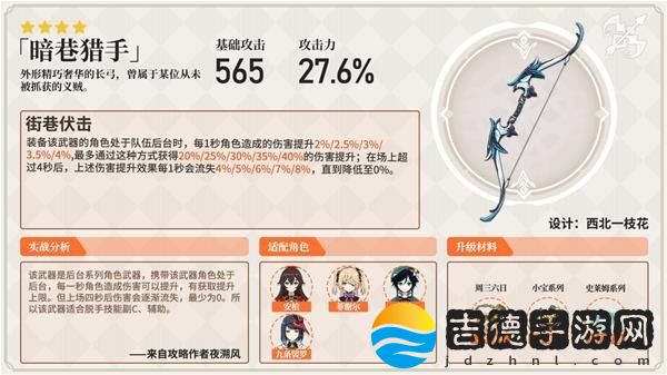 后台系列武器,武器要在后台造成伤害获得最大化收益。同时不能前台超过4秒站场,适合副C、辅助使用,同时拥有一定时间脱手技能角色。武器是输出类型的武器。这里九条、温迪、安柏是需要考虑元素爆发循环的角色,所以温迪、九条、安柏使用该武器需要考虑充能循环问题。