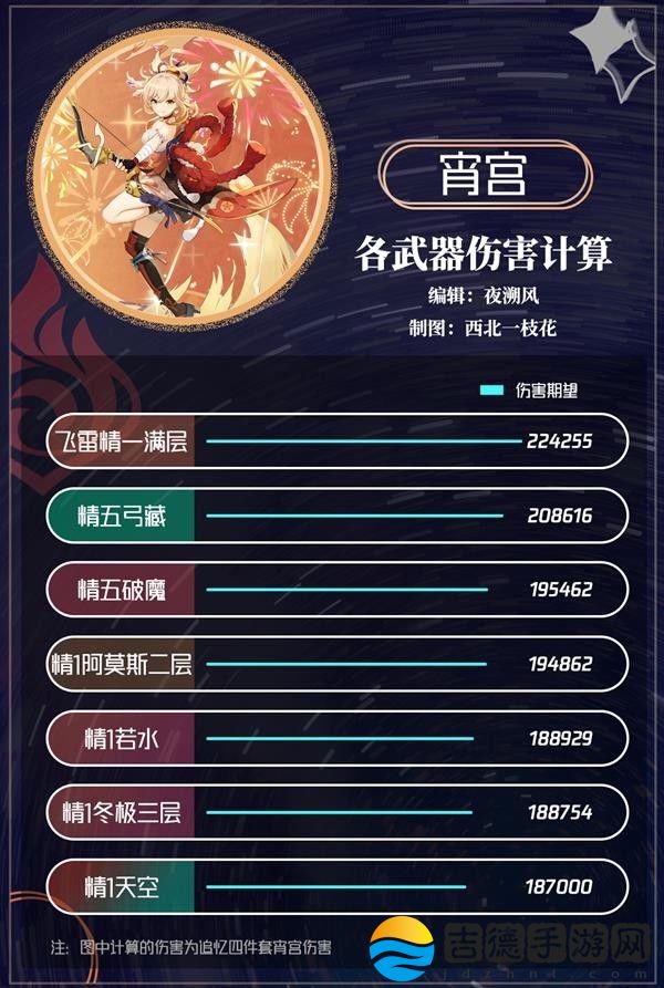 飞雷弦振对宵宫而言是领跑于其他武器的。阿莫斯由于宵宫离怪物远程伤害容易丢失,所以这里计入两层。由于宵宫元素战技没有伤害,所以这里最多只计入冬极三层。