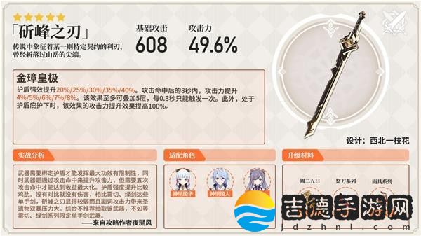 斫峰之刃该武器副词是较高攻击力加成,武器效果也是提供较多攻击力加成,但需要攻击命中叠层数。护盾强度提升大部分属于鸡肋,武器也需要绑定护盾才能收益最大化,有限制性。该武器强度中规中矩,没有对比就没有伤害。和其他五星单手剑雾切、绿剑比较,无论武器效果还是武器属性都更差,对大部分人而言可能并不希望限定池抽取该武器。