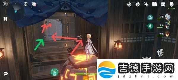 厅堂:更改箭台为红色,旋转绿色箭头所指的机关(红色箭头是箭台发射路径)