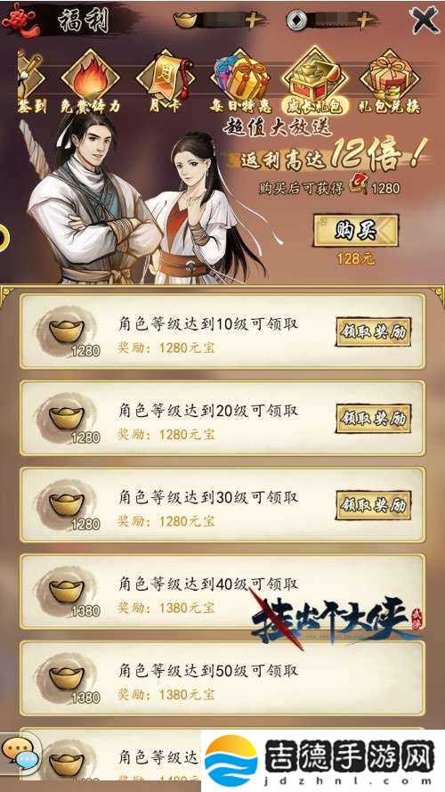 2. 点开充值,把开服礼包2个带体力的礼包都买了(6元新手和128冲级礼包),然后去超值礼包每日限购的10连武功礼包,648的高级武功礼包搞了。这么一顿折腾,至少拥有90个高抽券,先用掉一个10连,不急着全抽掉。首10连必出金,看是啥门派,等开放心愿单选相同的门派再抽几发,目的是要弄同名卡,然后每50次可去福源领个低保金。