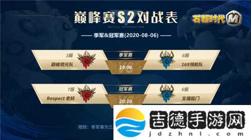 万众期待,石器巅峰赛S2最最精彩的一幕即将上演!越过万重险阻,穿过刀山火海,四支队伍终于汇聚一堂,由3服巅峰观光队与168领航队争夺季军,而在五福临门队与Respect 老妖队面前的,就是至高的巅峰荣耀——冠军!石器巅峰赛,是强者们最梦寐以求的舞台,在这里他们可以向千万石灰粉展示自己最强的技术与最狠毒的计谋,收获无上的荣耀,还有那一枚象征胜利的巅峰赛S2冠军戒指。