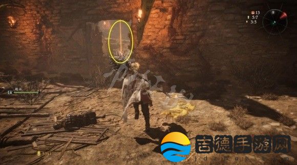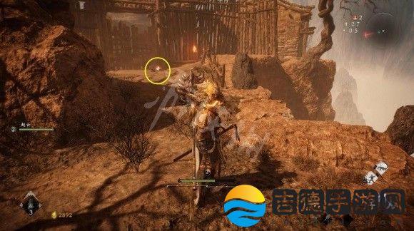 往前走到山道上,左边有个口子爬上去是条捷径。不过要从上面踢下木材才能打通,暂时可以不用管。