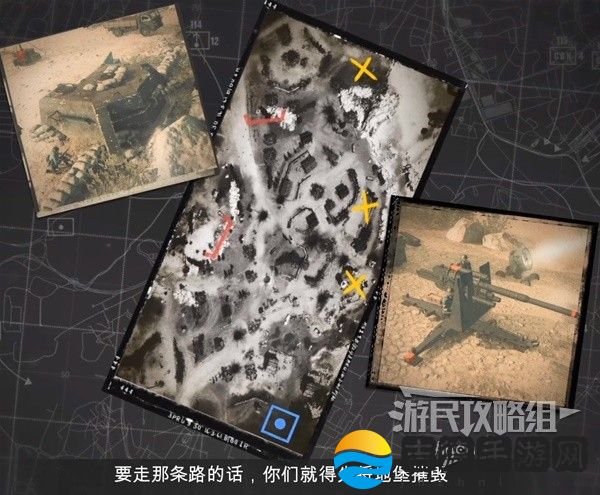 地图上红色感叹号处是加农炮,夺取并派工兵修复加农炮,为你提供轰炸支援。