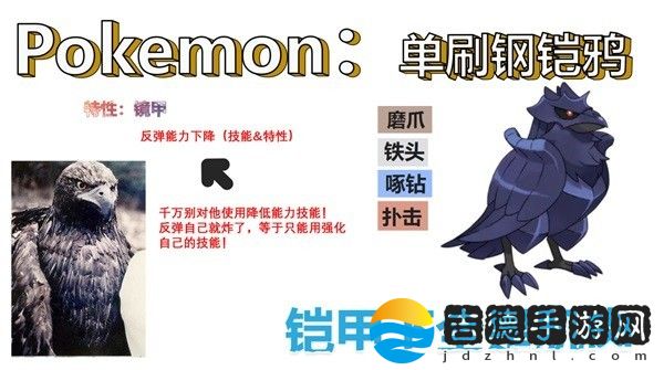 这个特性就跟之前那些平平无奇的特性不一样,作为钢铠鸦的梦特,镜甲非常强力,导致我们在太晶团战中无法使用刺耳声、假哭等降低能力变化的技能,因此哪怕组队也不好做到叠BUFF之后一击秒杀钢铠鸦。