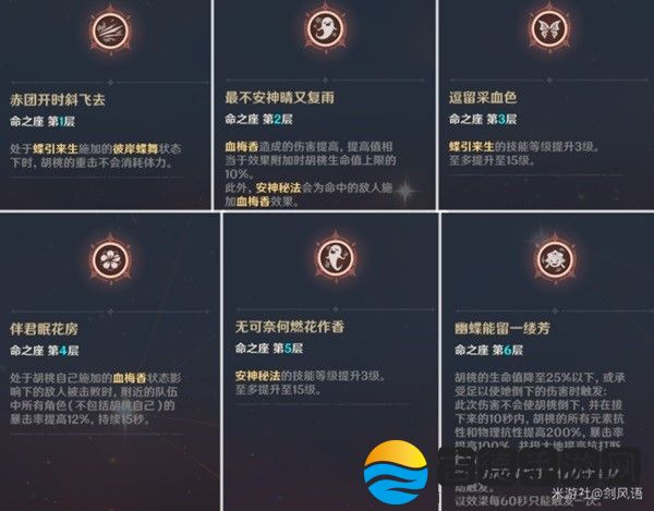 E技能:蝶引来生(核心输出技能之二),开启后胡桃将消耗一定生命值,并提升基于最大生命值的攻击力,同时进入9秒火元素附魔状态,重击命中敌人施加血梅香效果。