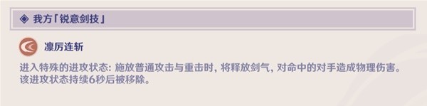 进入特殊的进攻状态:施放普通攻击与重击时,将释放剑气,对命中的对手造成物理伤害。该进攻状态持*6*后被移除。开启元素爆发,6秒内普攻伤害加成。