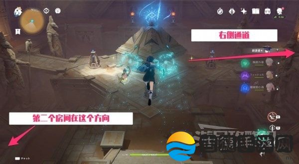 在进入中间大厅后,去第一个房间走右手边的通道。去第二个房间走下图所示的左侧下方通道。