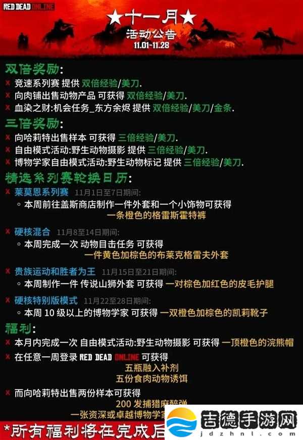 《荒野大镖客救赎2》11月的更新带来了很多的活动和道具奖励,想要知道本次更新内容的玩家请看下面“时光和你都很暖”带来的《荒野大镖客救赎2》2022年11月月度更新介绍,希望能够帮助大家。