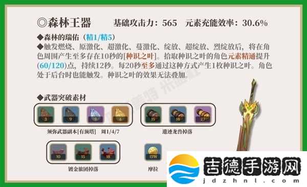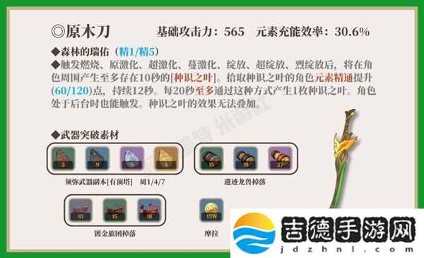 原木刀4星武器中,基础攻击力仅次于暗巷闪光(610),突破增加元素充能效率。掉落“种识之叶”全队都可以拾取,谁拾取谁加精通,最多拾取1枚。