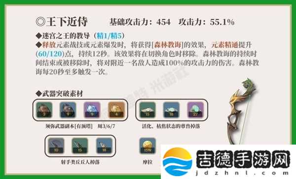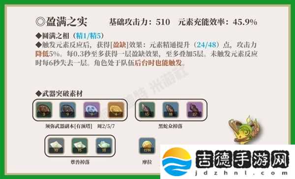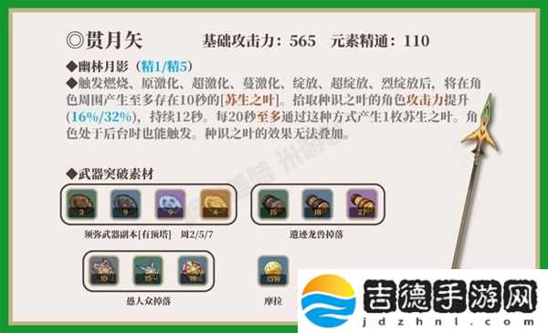 贯月矢副属性增加精通,被动产生的苏生之叶拾取后增加角色攻击力。目前能够契合的长柄武器角色也不多。