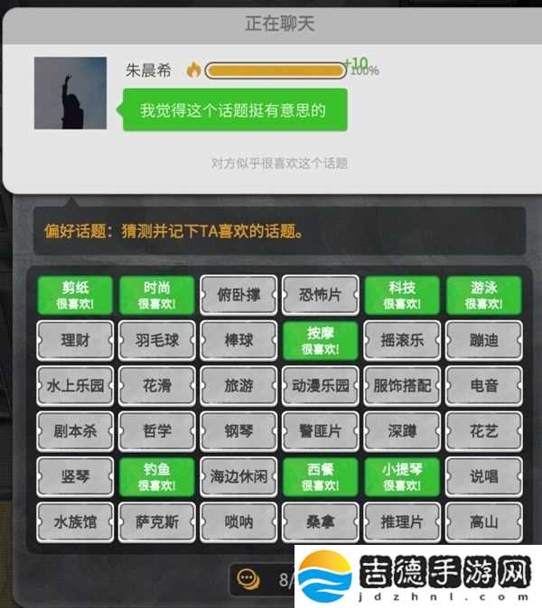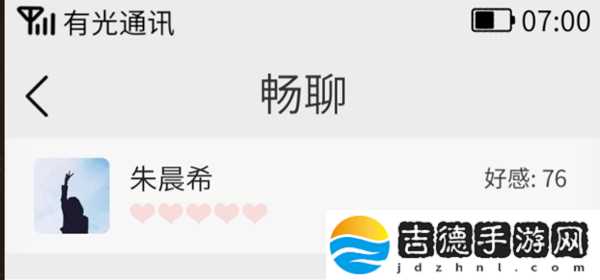 3.加到联系方式后按键盘O打开手机,选择畅聊,点击朱晨希并与她聊天,选择8个感兴趣的话题,每日最高增加亲密度7点!心智等级8级可以运用心智自动猜测喜欢话题8次!