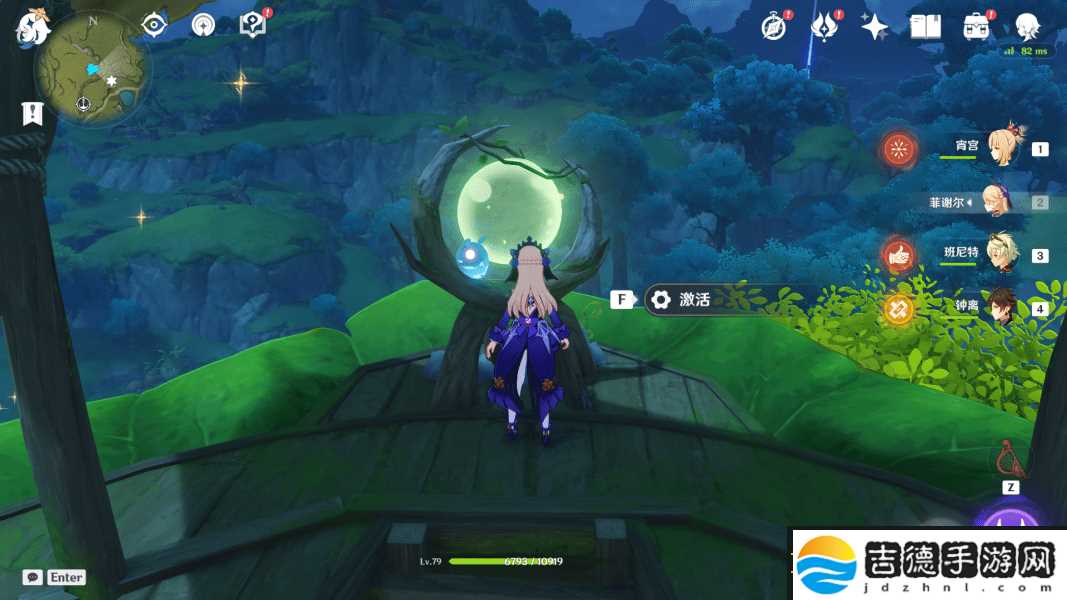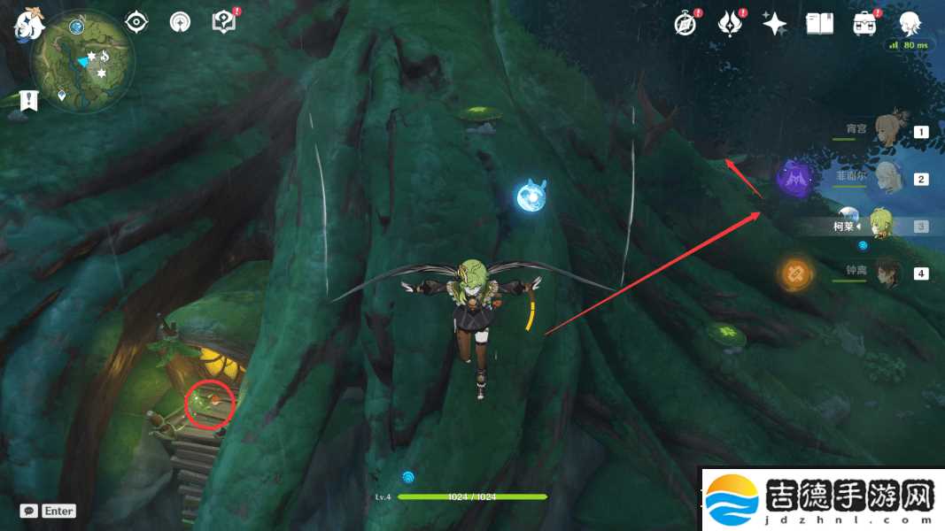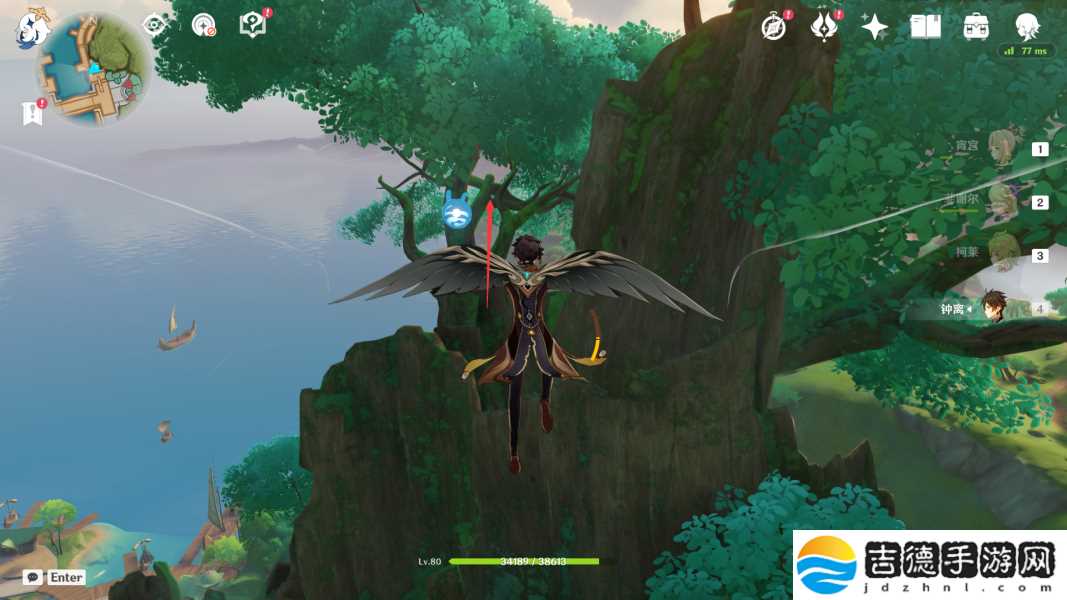 先从右边最高点传送点飞过去,往箭头的树枝上爬,就在上面
