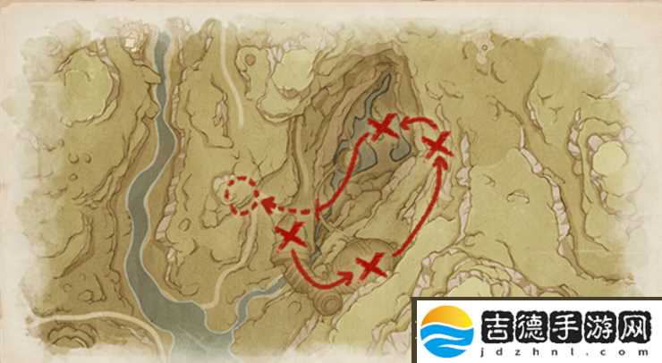 做【吉祥具书】任务的时候,我们会进入到这个巨像手砸开的洞窟里,在这个传送点附近有个营地,上面有四个火盆,按我标记的这个顺序点燃火盆,就可以拿到一个华丽的宝箱。