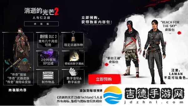 终极版内含:豪华版、 2小时夜间XP加成、 可供打印的壁纸、 数字漫画、 制作物品以及将在游戏上市数月后推出的两款剧情DLC的扩展版通行证。