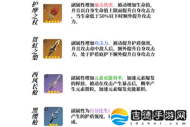 四星武器中可以选择西风长枪,副属性增加元素充能效率,而且被动在产生暴击后额外概率获得(精炼5阶为100%)元素微粒;当然也可以选择使用试作星镰,但是效果要相对逊色一些。而对于更注重钟离元素战技所释放的“玉璋护