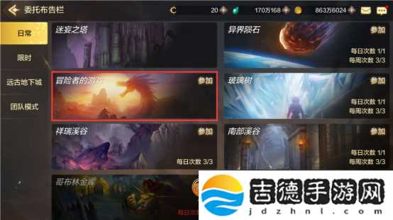 点击主页面右侧的【委托】—【日常】,选择【冒险者的游戏】后,点击入场,然后开始进行匹配,当匹配到其他玩家时即可一起进入该模式(并非组队通关,而是看谁最快到达终点,玩法类似大富翁)